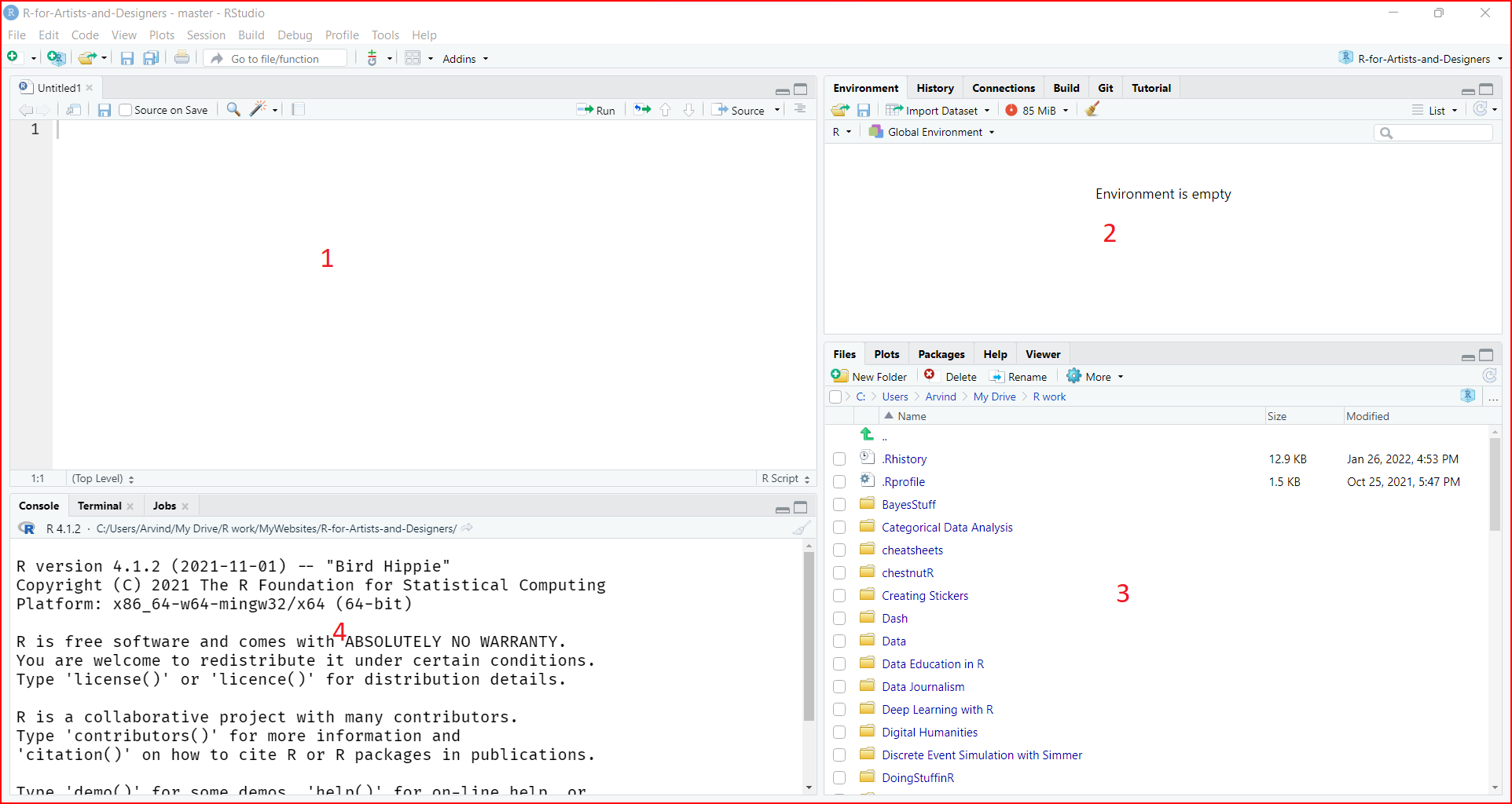 When you first open it, the RStudio interface is divided into four “Panes”: